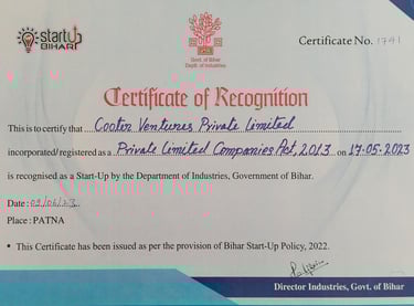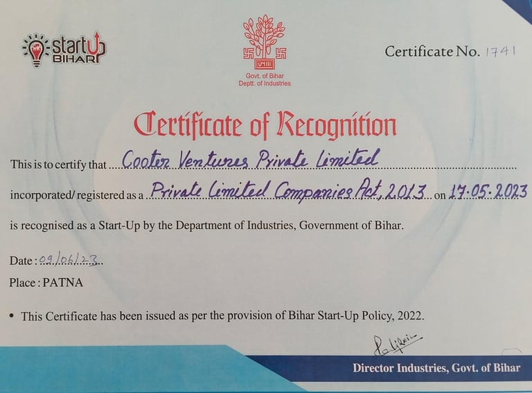 Cooter Ventures was recognized by Startup Bihar on June 9, 2023, reinforcing our mission to drive economic growth in Tier 2 & 3 cities. This recognition granted us a ₹10 lakh seed investment, structured as an interest-free loan for 10 years, with the first tranche of ₹4 lakh disbursed on June 14, 2023.